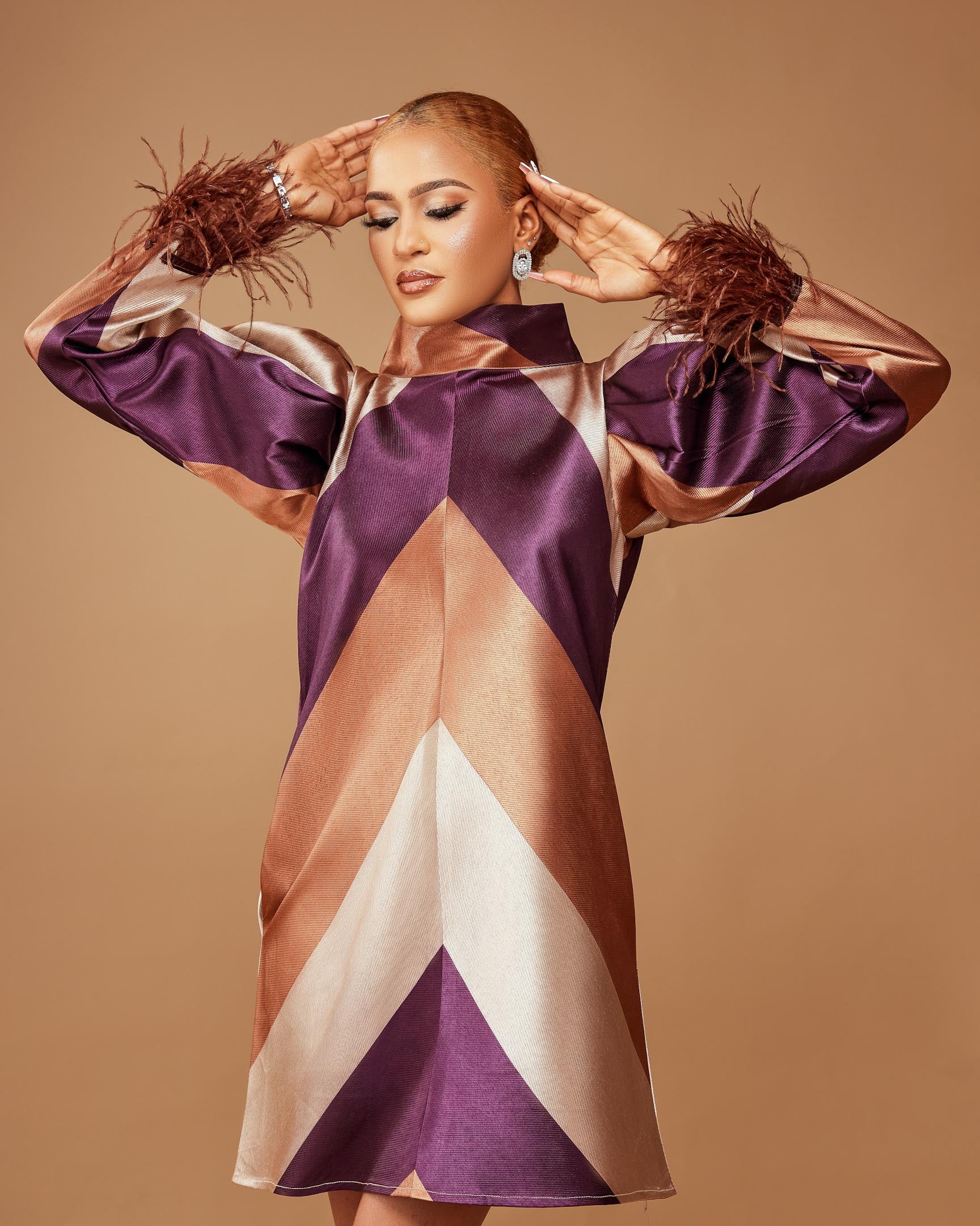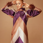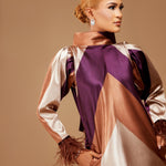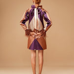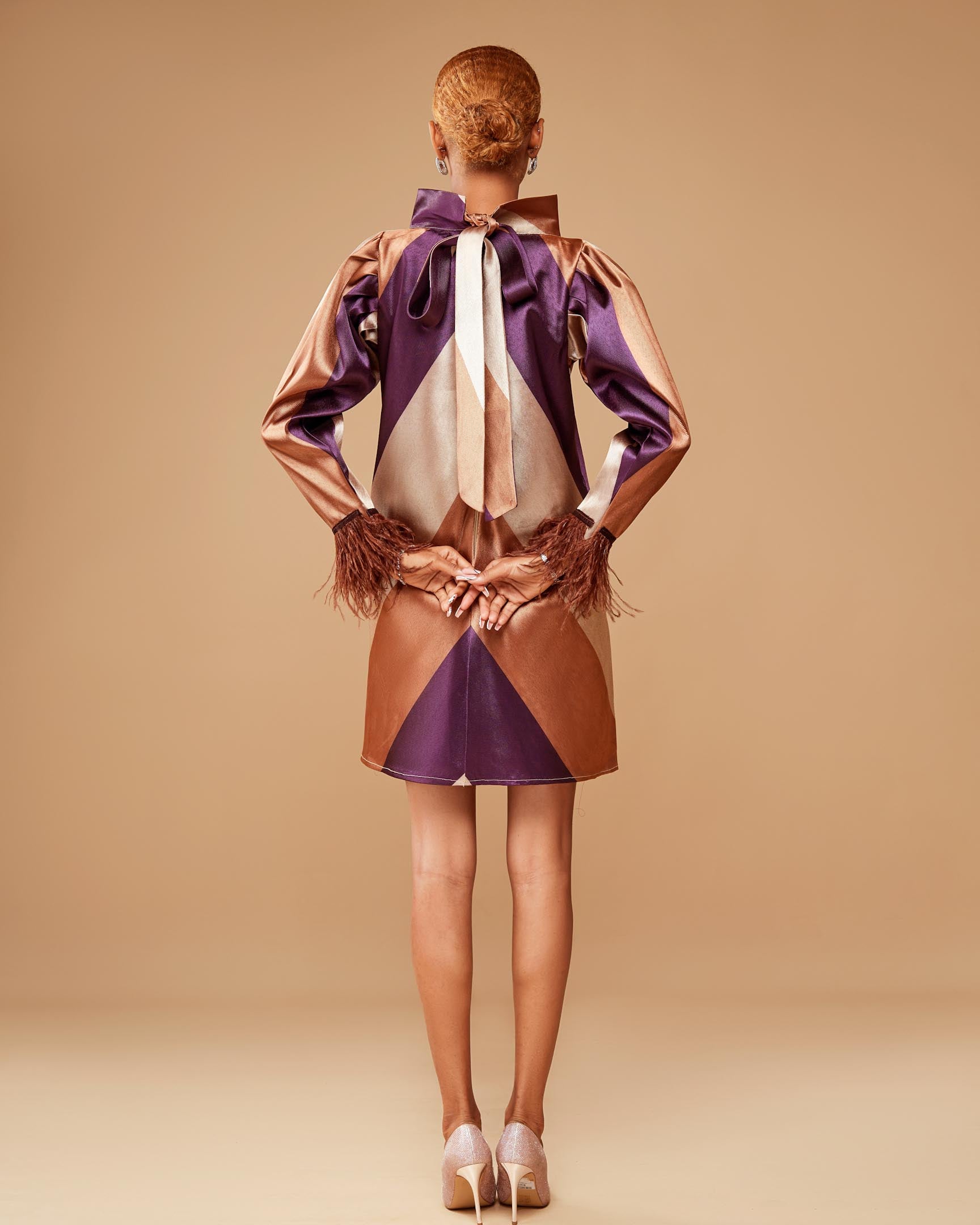 Bring back the glamour of the ‘60s with our Twiggy dress. It blends sophistication with playful femininity and luxurious detailing. The bronze, cream, and purple color scheme add a regal feel to this timeless silhouette. While the front appears minimalistic with its high collar detailing, the back features a playful bow closure.